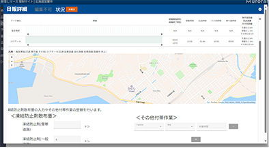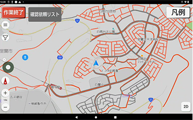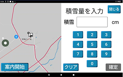 パトロール業務をタブレットで可視化。積雪情報やパトロールの結果をリアルタイムに共有できます。ナビ機能により、苦情現場へスムーズに到着することも可能です。