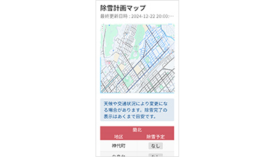 除雪車の位置・状況を除雪進捗をリアルタイムに地図表示。
