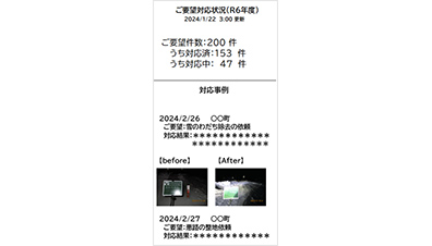 IVR(自動音声応答)やWEBから入る問い合わせを一覧表示。パトロールや除雪業者への対応指示も一括で行え、対応進捗の把握が容易に。対応漏れもなくなります。