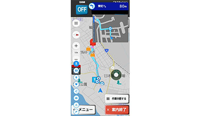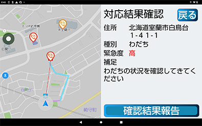 管制アプリから指定された現場確認依頼の情報を地図上に表示。ナビ機能で簡単に現場へ向かえます。確認結果は写真付きで即座に報告できます。