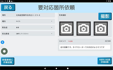 吹き溜まりなどの局所的な雪害を地図上に登録。除雪業者への依頼も位置情報、写真付きでシームレスに行え、連絡や情報伝達の手間を軽減します。
